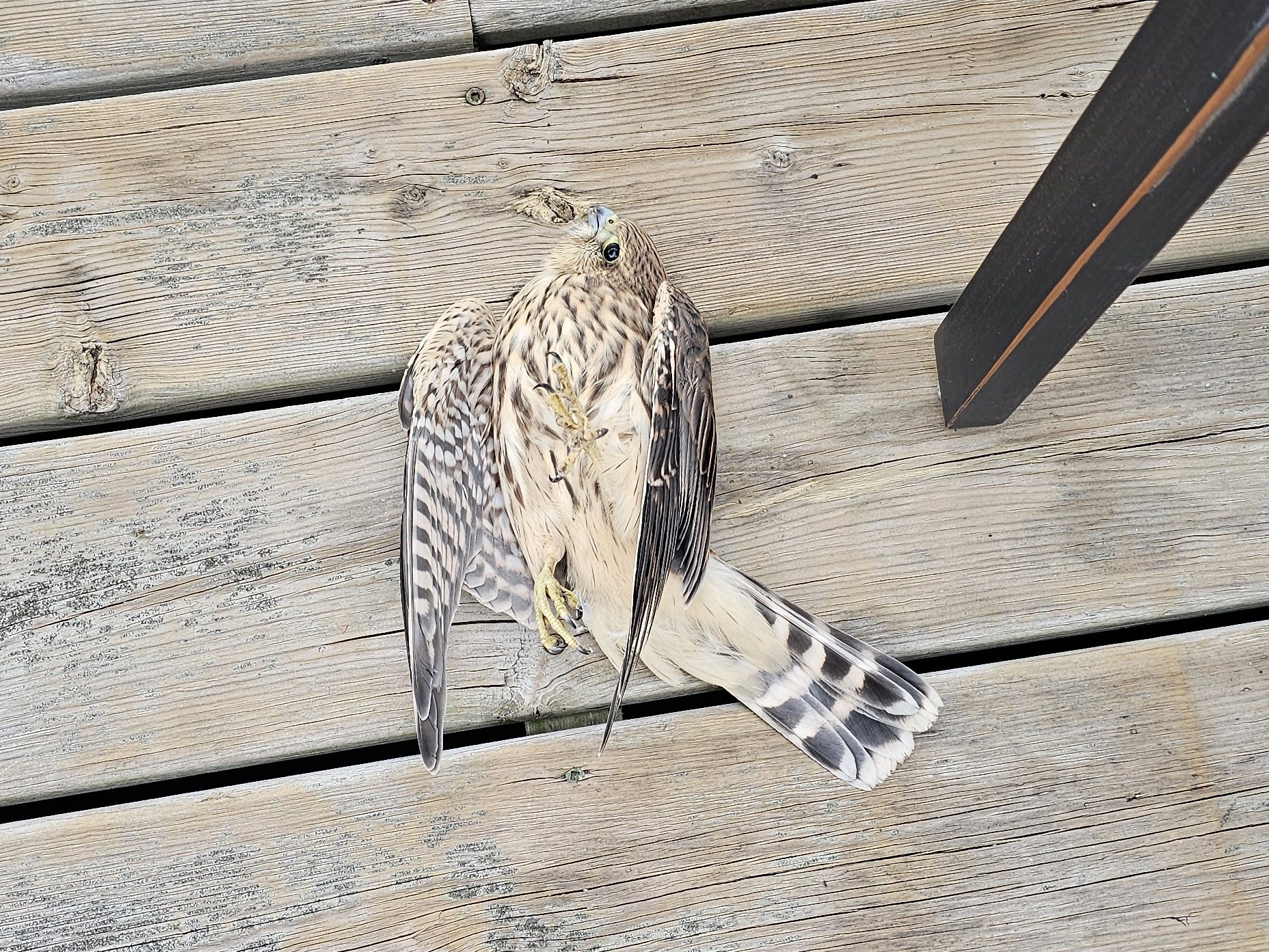 A text from my bud! “Call this number, while they’re still open! Looks like a female Merlin Falcon”. This was a different number than the one I had left two voicemails with. Yes, I called again just to be sure and back to that “Something to do. Do something” thing. This time I raise a human and get advice. Why I hadn’t googled “what to do with a stunned, possibly broken back or neck bird?” is just an indication of my stress level and/or perhaps age. The lady from rehab tells me that if they’re moving or hopping about let them be. Mom will protect and feed them on the ground. Actually that second bit came from the first rehab centre voicemail that had a detailed directory with one option being “If this call is about a baby bird, please press 2”. It gave a brief primer on finding baby birds, with the current insight that it’s “flying lesson time” and what to do, and not. No mention of baby-bird-versus-window-at-high-speed-and-is-not-hopping-around. I listened to it both times.