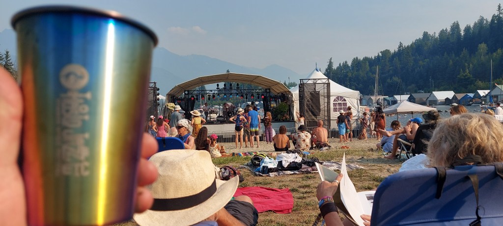 We’re at the Music Festival. We’ve made camp and are heading down to the main stage field to partake. This Festival was unique in being the first, a few years back, to allow beer consumption throughout the grounds, until 9pm when it was then confined to the traditional “Beer garden” area. Somewhere along the way today we’ve seen “reusable cups only” signs.